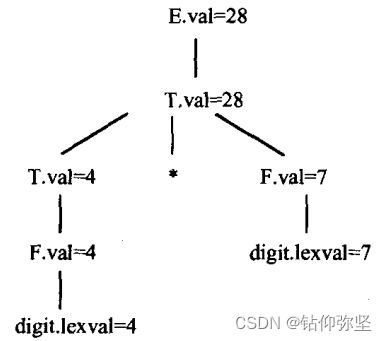 当在这个结点应用语义规则时,根据规则T→T1*F得到左子结点,val的值为4,从右子结点得到F.val值为7。因此,在这个结点中算得T.val的值为28。再由E→T知E.val的值为28。