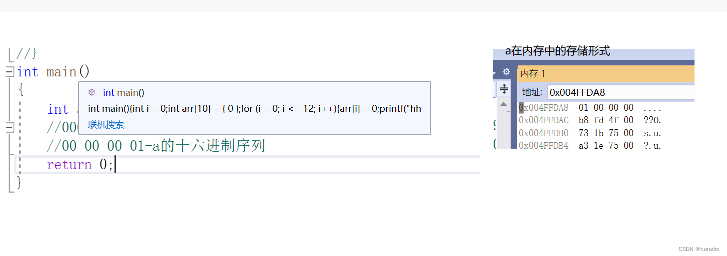 //如果是小端储存则a在内存中的储存方式应为01 00 00 00
