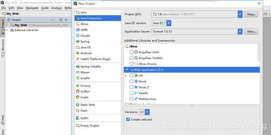 本文介绍了如何在IntelliJ IDEA中创建普通Java项目和Web项目。对于Java项目,详细步骤包括新建项目并添加jar包依赖。对于Web项目,步骤涉及选择Java Enterprise,配置Tomcat,创建Web Application,设定类路径和库路径,以及添加和管理jar包。最后,还提供了编辑和测试index.jsp文件以及启动Tomcat的方法。