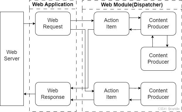 其中,TWebRequest *Request, TWebResponse *Response 这个两个参数属于Web Application的,它们和Action Item进行交互。如上图2所示。