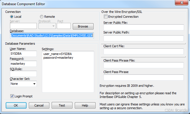 在本教程中,你使用的是随 RAD Studio 安装的 EMPLOYEE 数据库。其路径通常是 C:\Users\Public\Documents\Embarcadero\Studio\21.0\Samples\Data\EMPLOYEE.GDB。如果你设置了用户名和密码,LoginPrompt 可以是 false。
