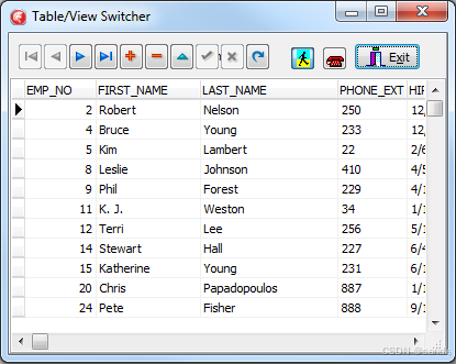 注意 TDBGrid 是空的,因为没有选择表。点击左侧的 TSpeedButton 以显示 EMPLOYEE 表:
