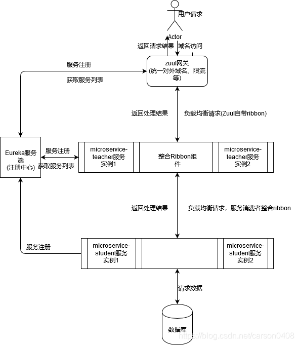 具体架构图如下图所示, 点击原图可以查看,(1)用户通过域名请求,(2)zuul网关根据域名以及从eurake服务器中获取的服务列表,根据负载均衡机制,分配给其中的一个老师实例。(3)老师实例根据负载均衡机制(ribbon)访问相应的学生实例,(4)学生实例则访问数据库获取数据,(5)然后反向将结果返回给用户,整个流程中所涉及的服务包括网关都会在eurake注册中心注册服务。以上是以下架构图完整的请求到响应的过程。