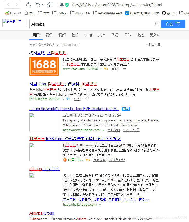 1.根据搜索的关键字构造对应的URL地址,URL地址满足Get请求的格式,即"http://网址?字段名1=字段内容1&字段名2=字段内容2",这里字段wd=Alibaba,可以结合搜索信息构造URL。