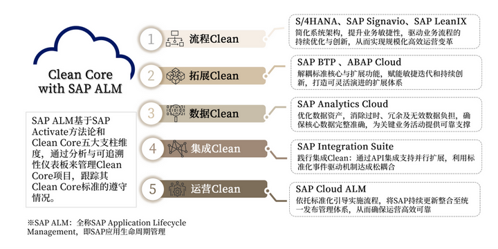 这五大支柱共同支撑起 Clean Core 的核心价值:让 ERP 系统贴近标准功能、保持精简,通过云原生技术承载差异化需求。