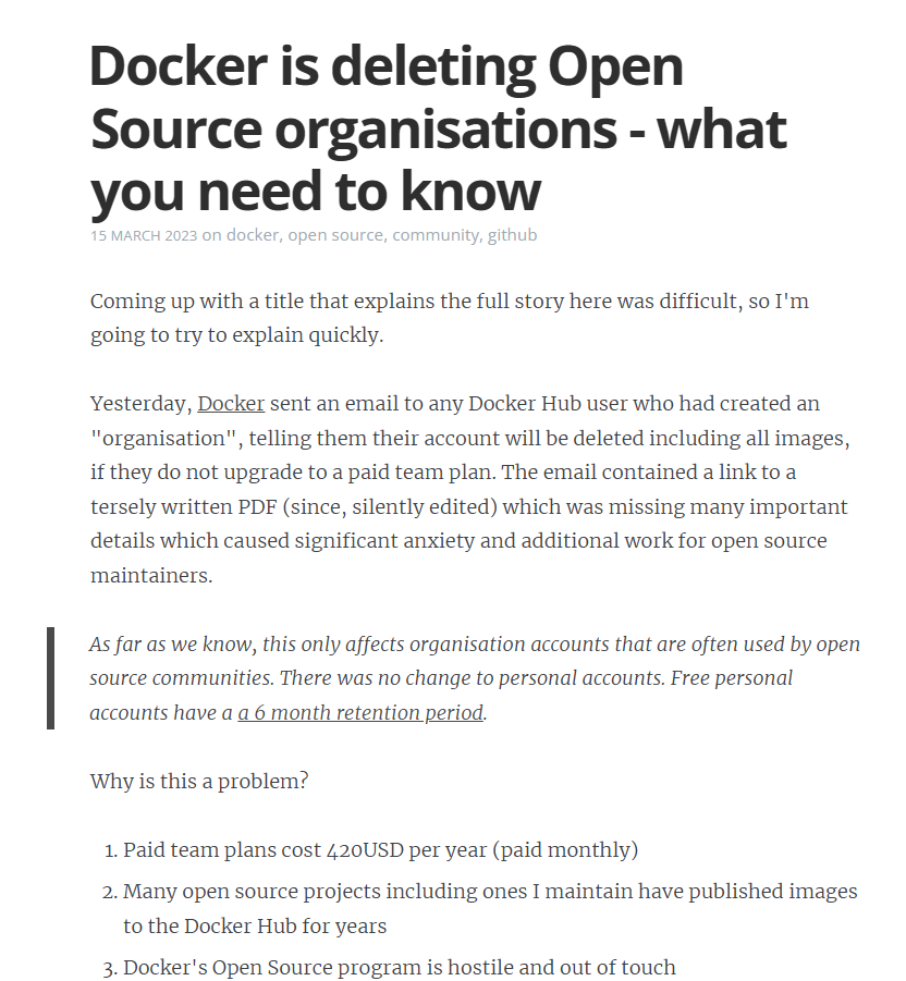 作为Docker 的铁杆拥护者,“Docker Captains” 的忠实成员 Alex Ellis 在其博客发长文控诉 。本身就是付费用户的他并不反对 Docker 赚钱,但 Docker 的沟通方式和效果都糟糕透顶,给很多最忠诚、最支持他们的社区用户制造了焦虑,他们挟镜像以令开源的做法,暴露了他们对开源可持续问题的虚伪态度,这一项计划充满了敌意和脱节操作。