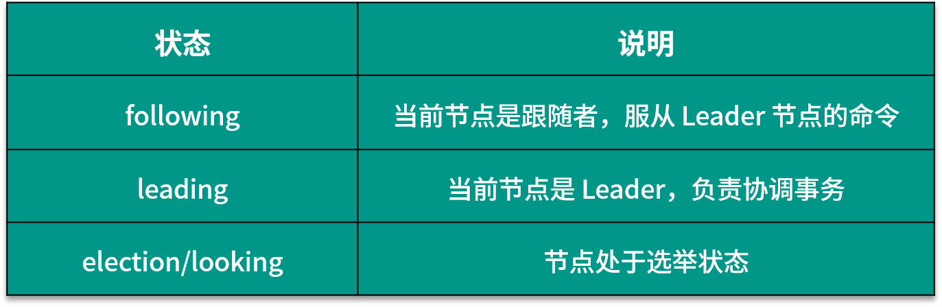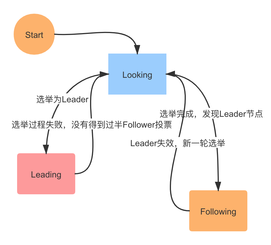 Zab 中的节点有三种状态,伴随着的 Zab 不同阶段的转换,节点状态也在变化: