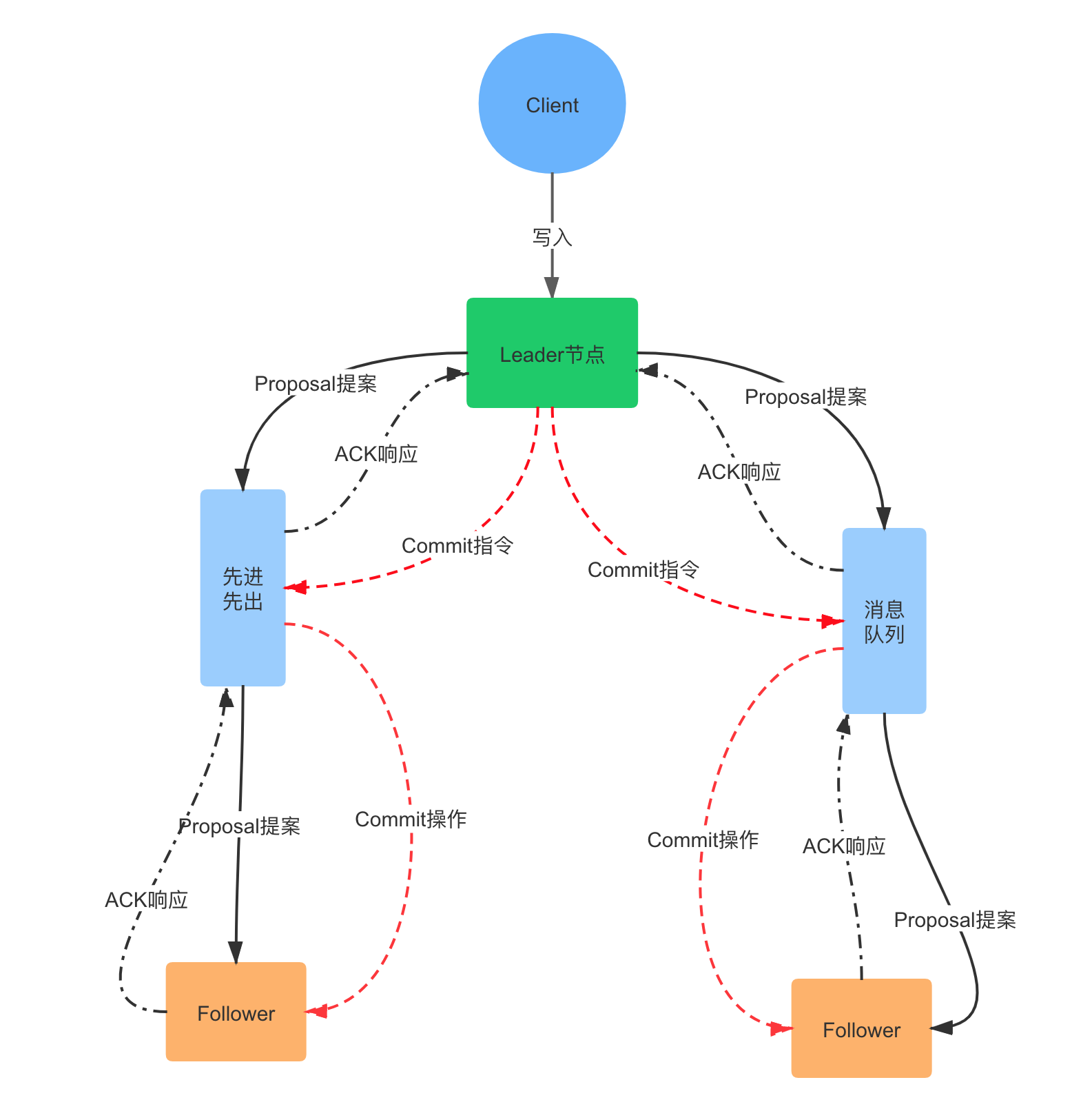广播这个 Proposal 事务,Leader 节点和 Follower 节点是解耦的,通信都会经过一个先进先出的消息队列,Leader 会为每一个 Follower 服务器分配一个单独的 FIFO 队列,然后把 Proposal 放到队列中;