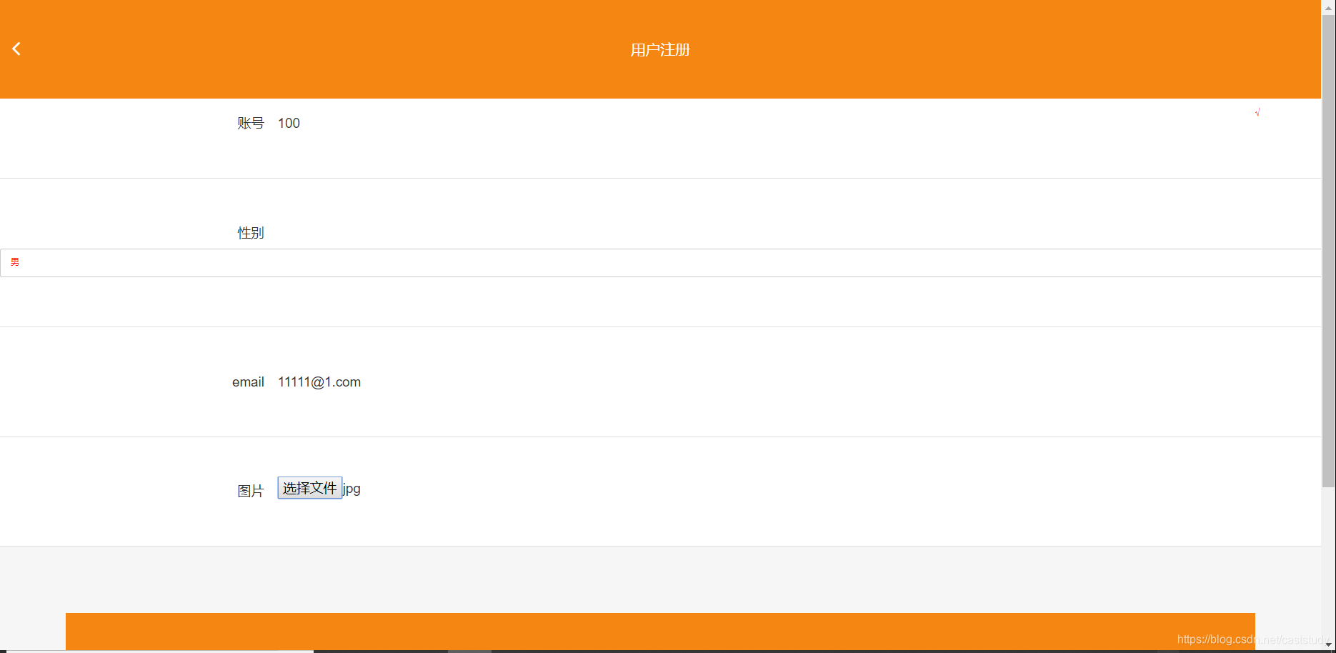 :用户id(主键通过异步校验有效性),用户密码、性别(下拉) ,email(type='email' 唯一) 状态(有默认值)