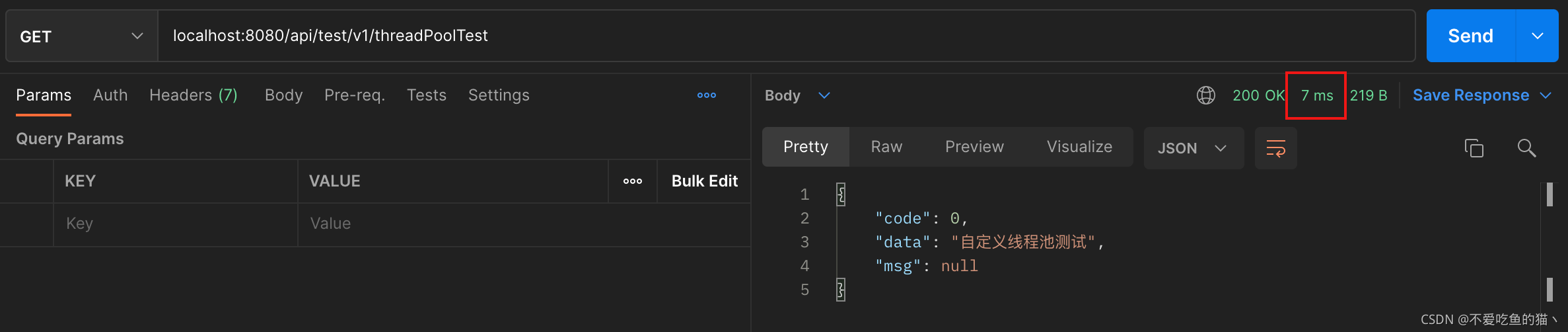 - 用postman测试这个接口,可以看到响应时间只有7ms
