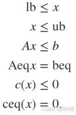 Aeq是Me×N矩阵,其中Me是等式的数目,而N是变量的数目(x0 中的元素数)。对于大型问题,将Aeq作为稀疏矩阵传递。 - beq:线性等式约束,