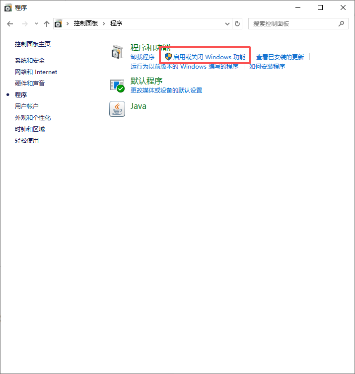 点击 “程序” → “程序和功能” → “启用或关闭 Windows 功能”。