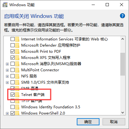 在弹出的窗口中,找到并勾选 “Telnet 客户端” 选项,点击 “确定” 等待安装(无需联网,系统自带组件)。 -