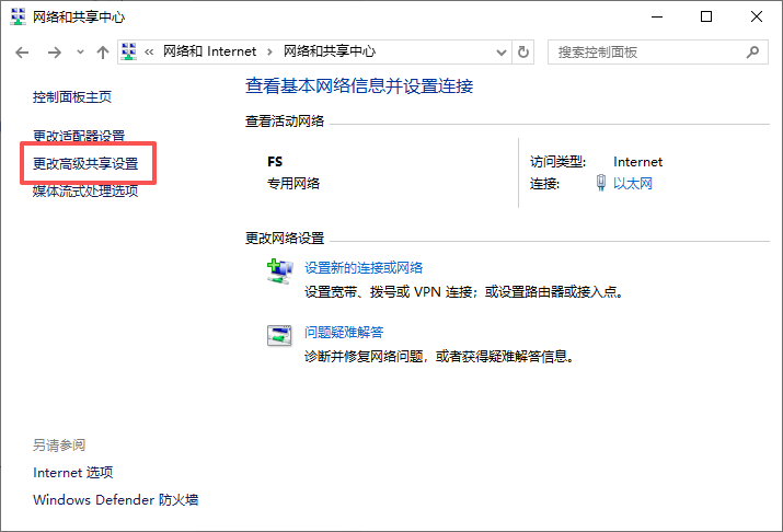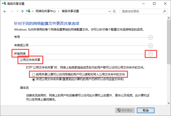 然后找到 所有网络=>公共文件夹共享=>启用共享xxxx,点击启用
