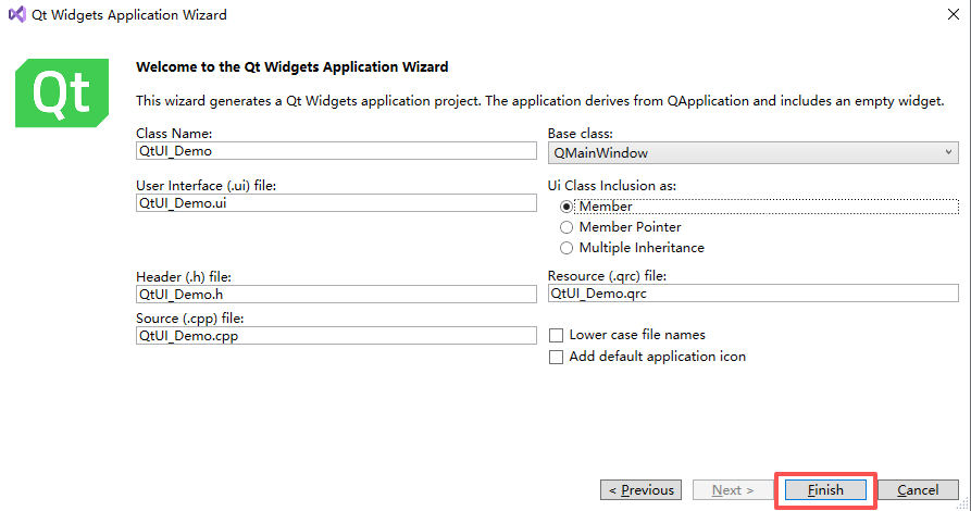 Generate form(核心!会自动生成.ui界面文件); - 其他选项默认 → 点击「Finish」。