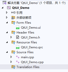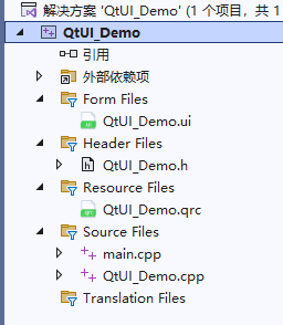 QtUI_Demo.ui:Qt Designer 可视化界面文件;QtUI_Demo.h/QtUI_Demo.cpp:界面逻辑代码文件;main.cpp:程序入口。