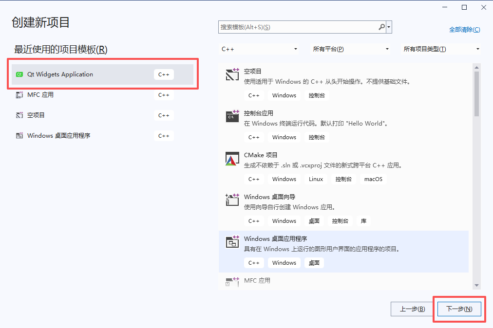 Qt Widgets Application→ 选择该模板 → 「下一步」;