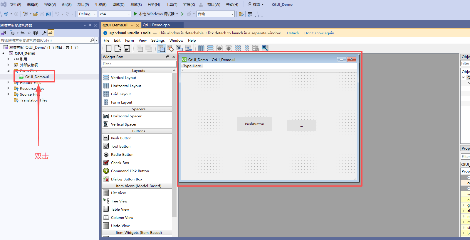 QtUI_Demo.ui文件 → 自动启动 Qt Designer; - 方式 2:VS 顶部菜单 → 扩展 → VS Tools → Launch Qt Designer → 手动打开