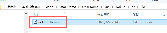 在项目文件中我是没有发现有自动生成的头文件(ui_QtUI_Demo.h)