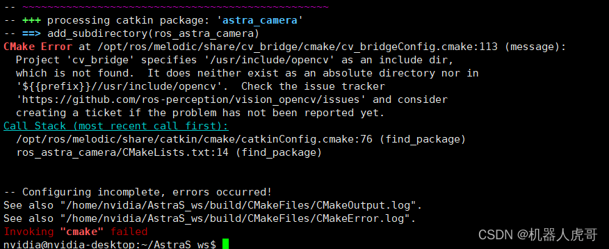 1、CMake Error at /opt/ros/melodic/share/cv_bridge/cmake/cv_bridgeConfig.cmake:113 (message):