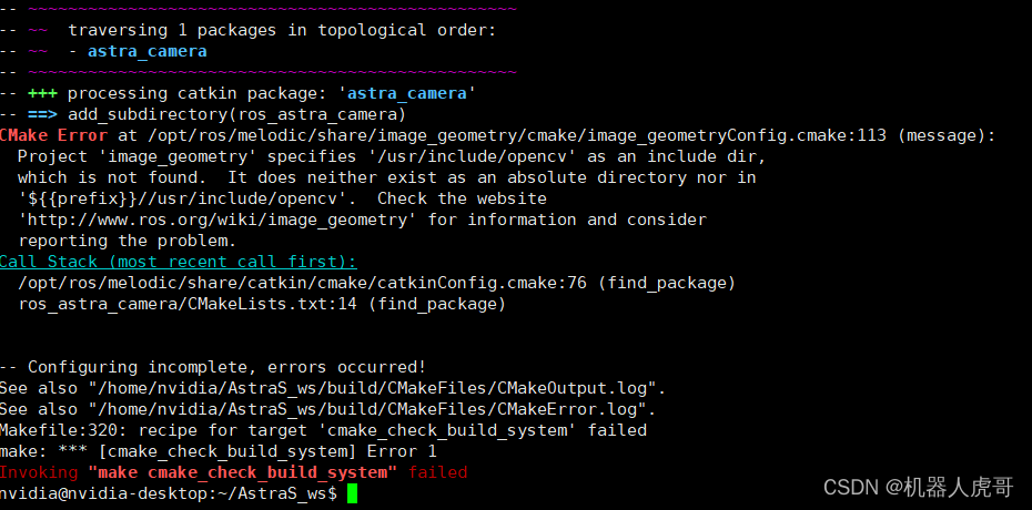 2、CMake Error at /opt/ros/melodic/share/image_geometry/cmake/image_geometryConfig.cmake:113 (message):