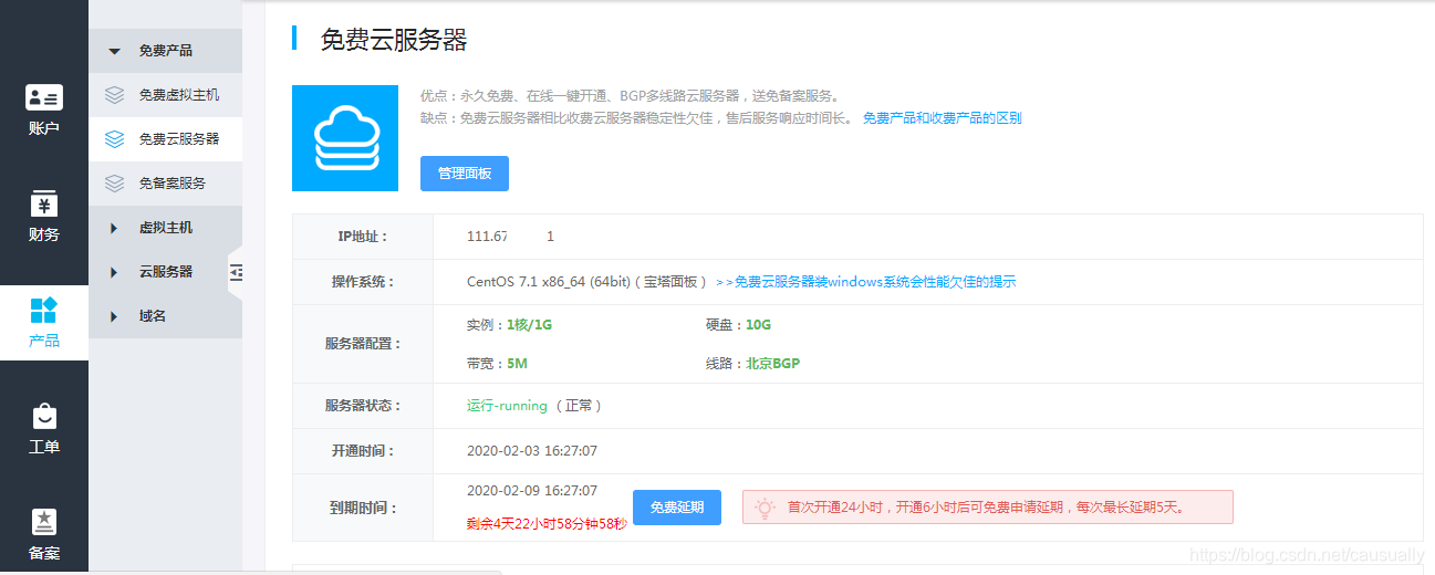 第一次申请,需要配置云服务器,打开管理面板,进行安装系统,密码设置,查看ip,免费延期等服务。