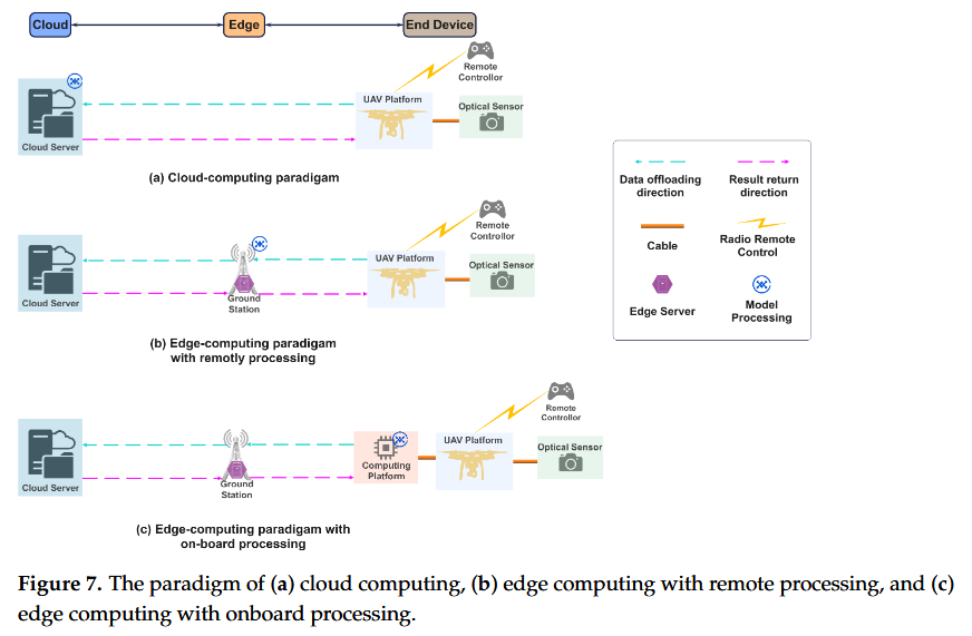边缘计算的兴起:为了克服传统云计算模式下数据传输延迟和隐私问题,**边缘计算(edge computing)**被视为一种理想的解决方案,它将计算任务从云端转移到无人机或地面站等更靠近数据源的设备上。