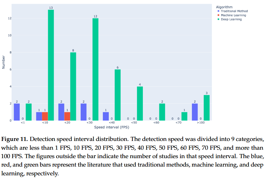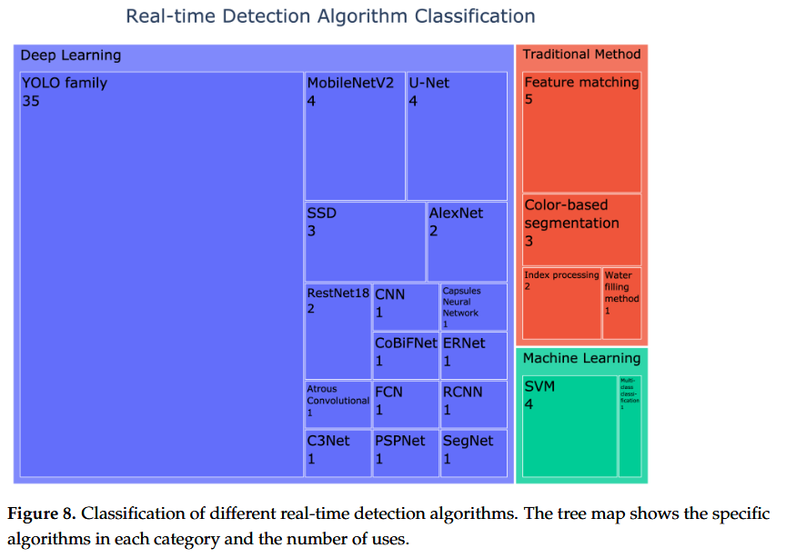 图8.不同实时检测算法的分类。树形图显示了每个类别中的具体算法以及使用次数。
