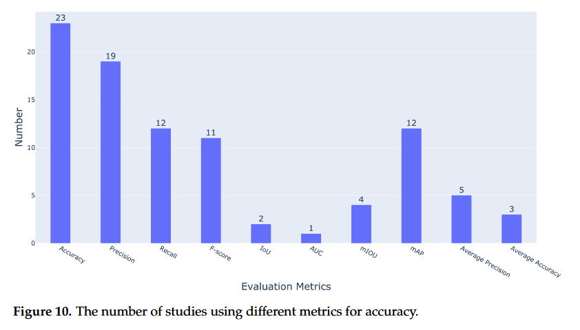 “Figure 10. 图10.使用不同准确性指标的研究数量。” (Cao 等, 2023, p. 16)