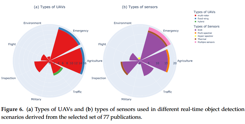 图6.(a)无人机的类型和(b)在不同实时物体检测场景中使用的传感器的类型,来自选定的77份出版物。