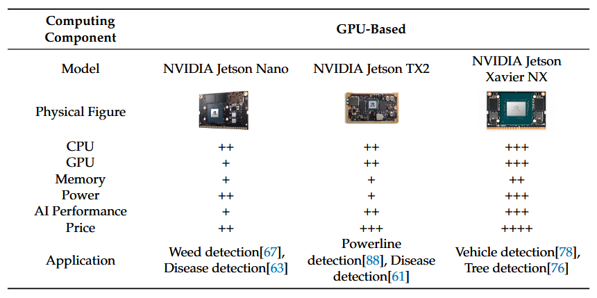 表4.常用的基于GPU的计算平台示例列表。表中符号“+”的数量表示性能水平,“+”越多表示性能越强。中央处理器(CPU)、图形处理器(GPU)、内存、功耗和AI性能的关键参数进行了比较。还列出了这些计算平台的价格进行比较。还列出了一些典型研究在所选文献中的应用。