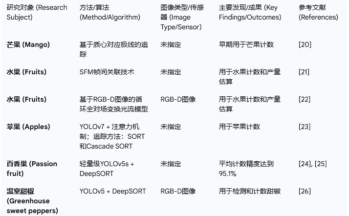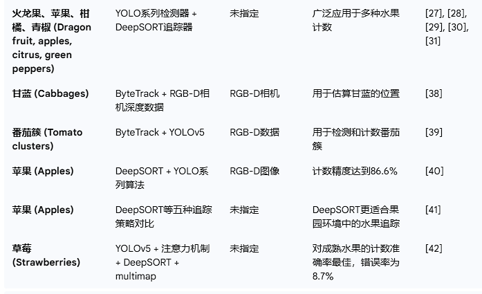 主流方法: 提到了目前最常见的组合是使用 YOLO 系列模型进行物体检测,并结合 DeepSORT、ByteTrack 等追踪器进行跨帧追踪。文章列举了大量应用案例,涵盖了多种水果,如苹果、百香果、甜椒、番茄等,并提供了具体的计数精度数据。