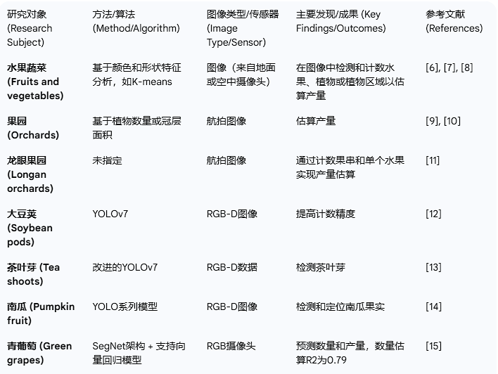 技术与算法: 提到了多种用于水果检测和计数的算法,包括传统的基于颜色/形状的K-means算法,以及更现代的深度学习模型,如YOLO系列、SegNet和**Deeplab V3+**等。