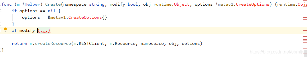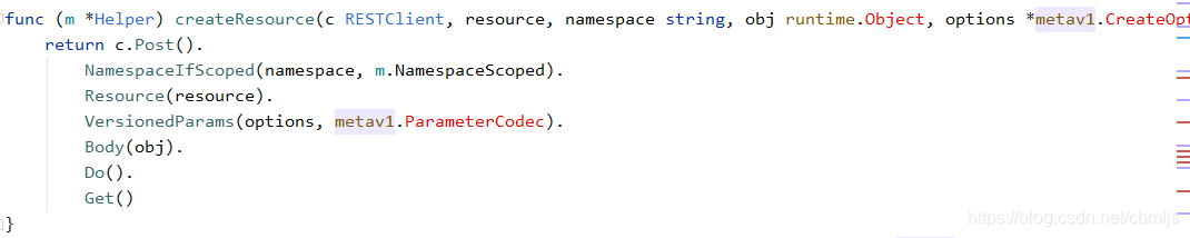 可以看到Create函数调用了一个createResource函数。以及实际向API Server发送的用来创建yaml文件描述的资源的REST调用。