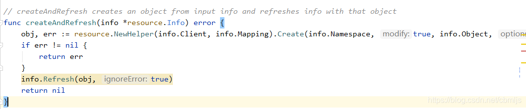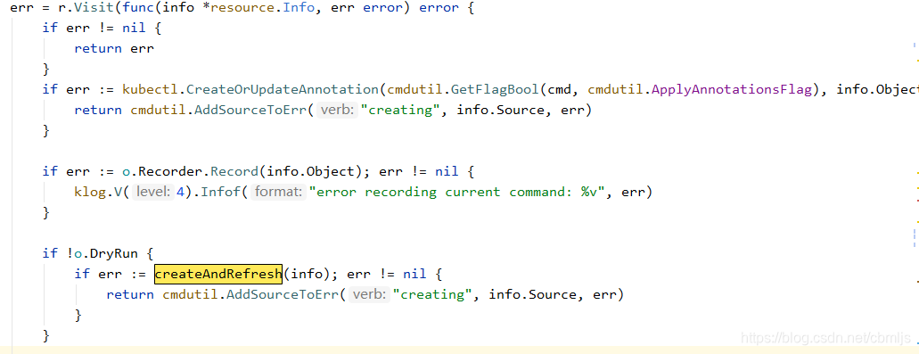 调用了r.Visit函数,该函数的实现就是visitor.go中的Visit函数(这里的先不介绍Visit方法,后续在介绍),然后调用了createAndRefresh函数: