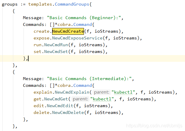 这个方法调用了NewKubectlCommand()方法,在这个方法内,构建了一个kubectl子命令集合(通过cobra脚手架的方式),截取部分如下: