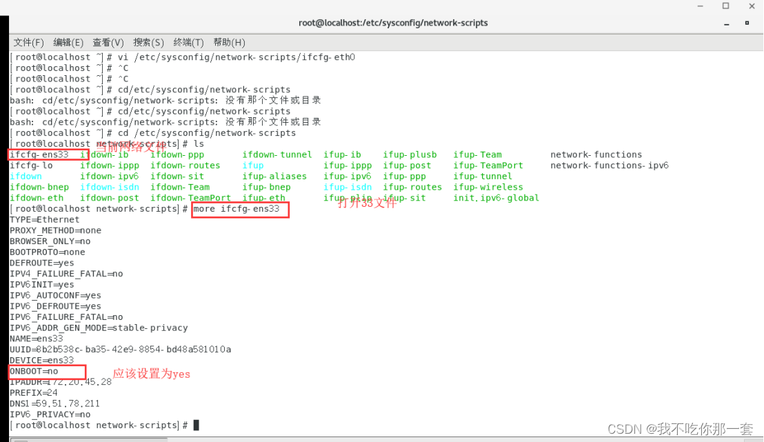 原因是物理网卡文件内的ONBOOT文件值是NO,并没有保存之前网络的设置,应该为YES。即以后这个网卡配置就保存了。