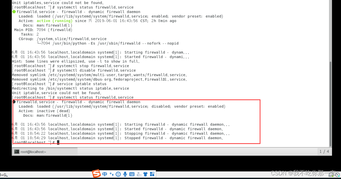 - 在开机时禁用一个服务:systemctl disable firewalld.service