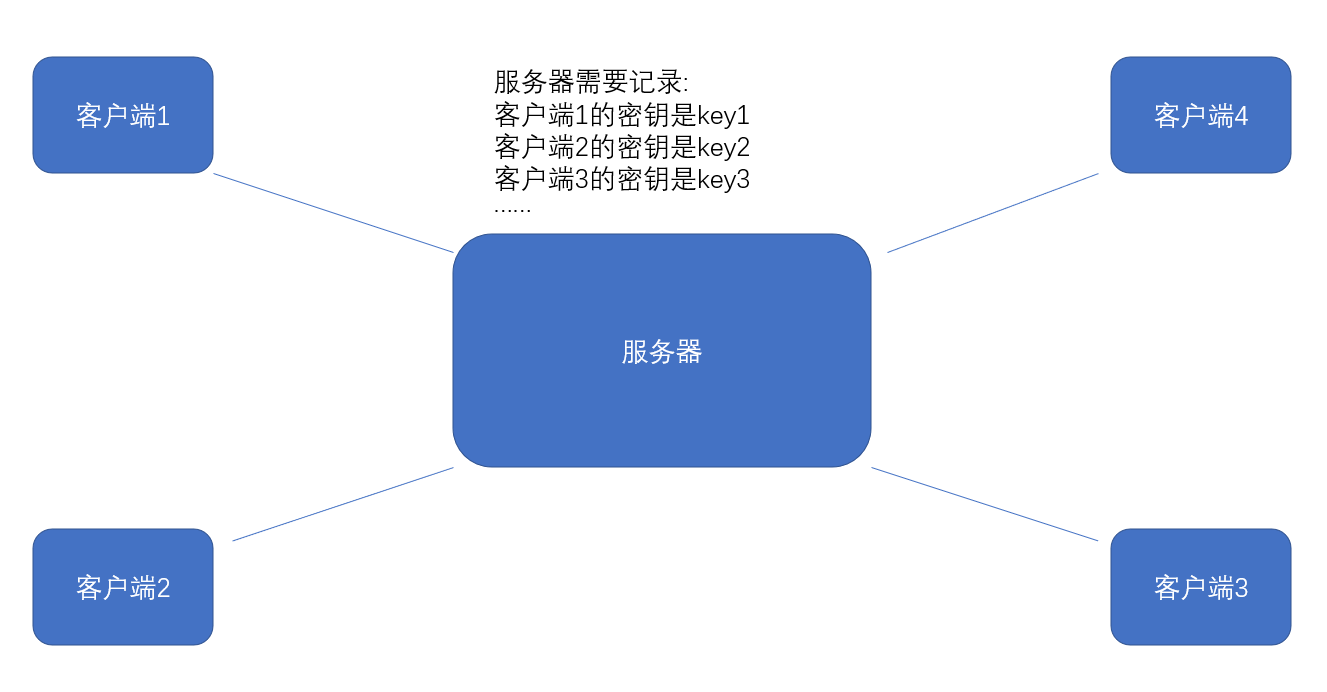 仔细思考,上面的模型存在一个重要问题,服务器不是只和一个客户端通信, 而是和很多客户端通信,这些客户端使用的 对称密钥 是相同的嘛?