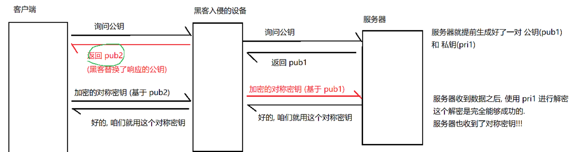在黑客入侵的设备这边,黑客自己也生成一对非对称密钥,其中公钥pub2,私钥pri2,黑客收到加密的对称密钥之后,因为这个密钥是pub2加密的,需要pri2进行解密,黑客手里当然有pri2(他自己生成的),黑客解密之后就拿到了对称密钥,并且使用服务器刚才的pub1重新对对称密钥进行加密,进一步的发送给服务器.