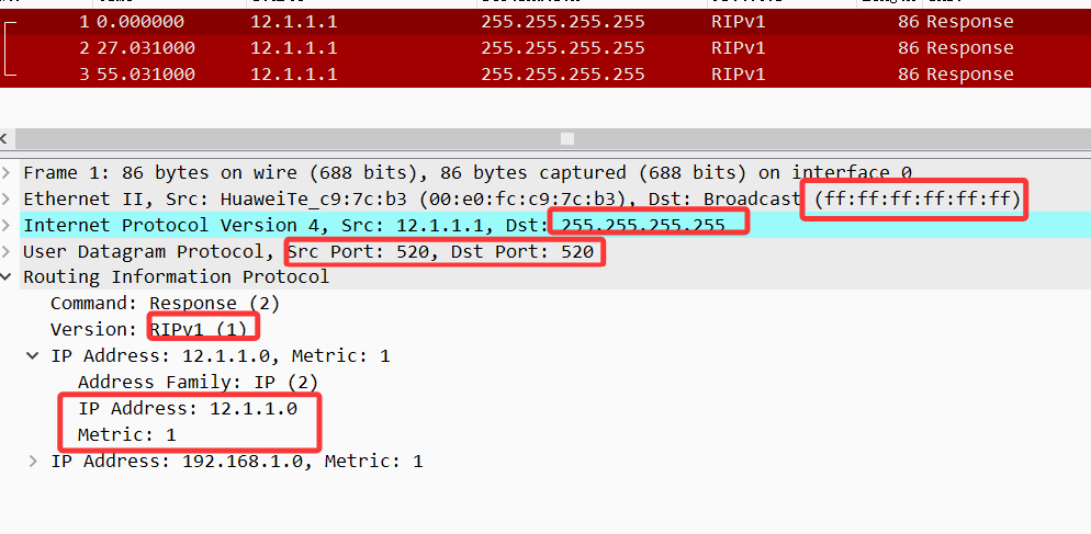 RIPv1是广播发送数据报文,不携带真实掩码信息,导致接收方按照主类学习路由。