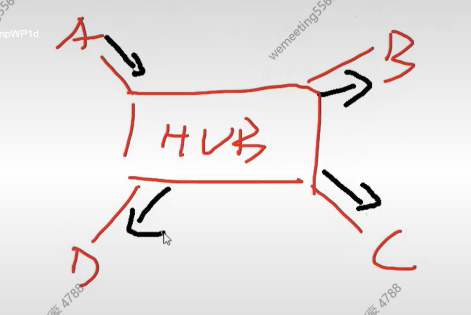 当某个接口接收到电信号后,HUB设备会将该电信号进行复制,然后从除了进入接口以外的其他接 口发送。