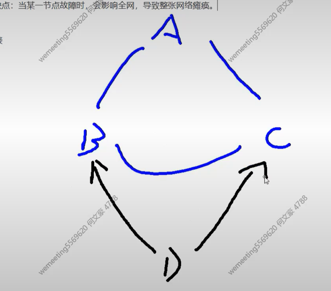 缺点:当某一节点故障时,会影响全网,导致整张网络瘫痪。