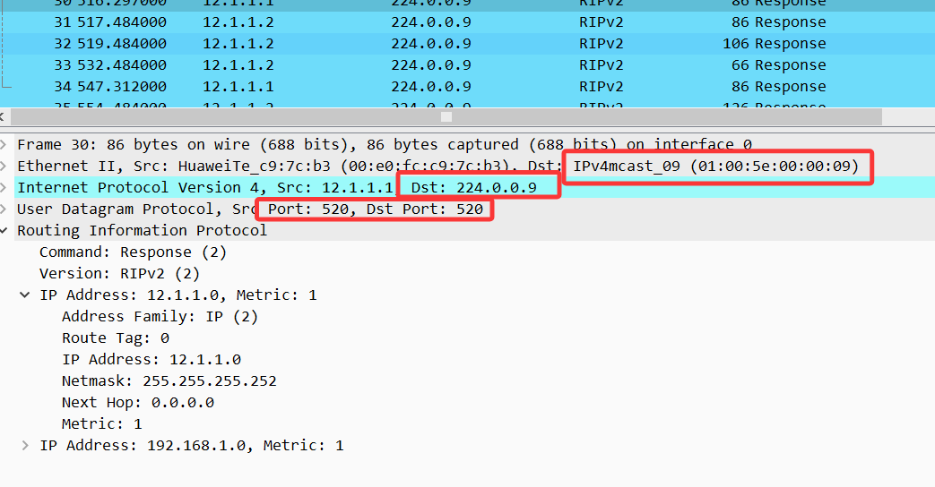 RIPv2是组播224.0.0.9发送数据报文,携带真实掩码,接收方按真实路由学习,且具备自动汇总和 手工认证功能。