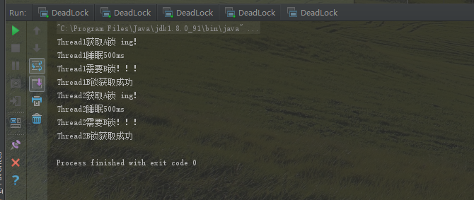 结果很明显了,这两个线程陷入了死锁状态了,发生死锁的原因是,两个线程试图通过不同的顺序获得多个相同的锁。如果请求锁的顺序相同,