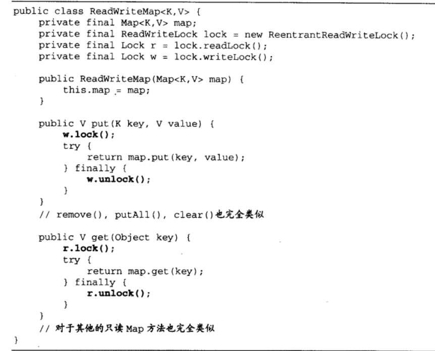 当锁被持有的时间相对较长,并且大部分操作都不会改变锁守护的资源,那么读写锁能够改进并发性。ReadWriteMap使用了ReentrantReadWriteLock来包装Map,使得它能够在多线程间