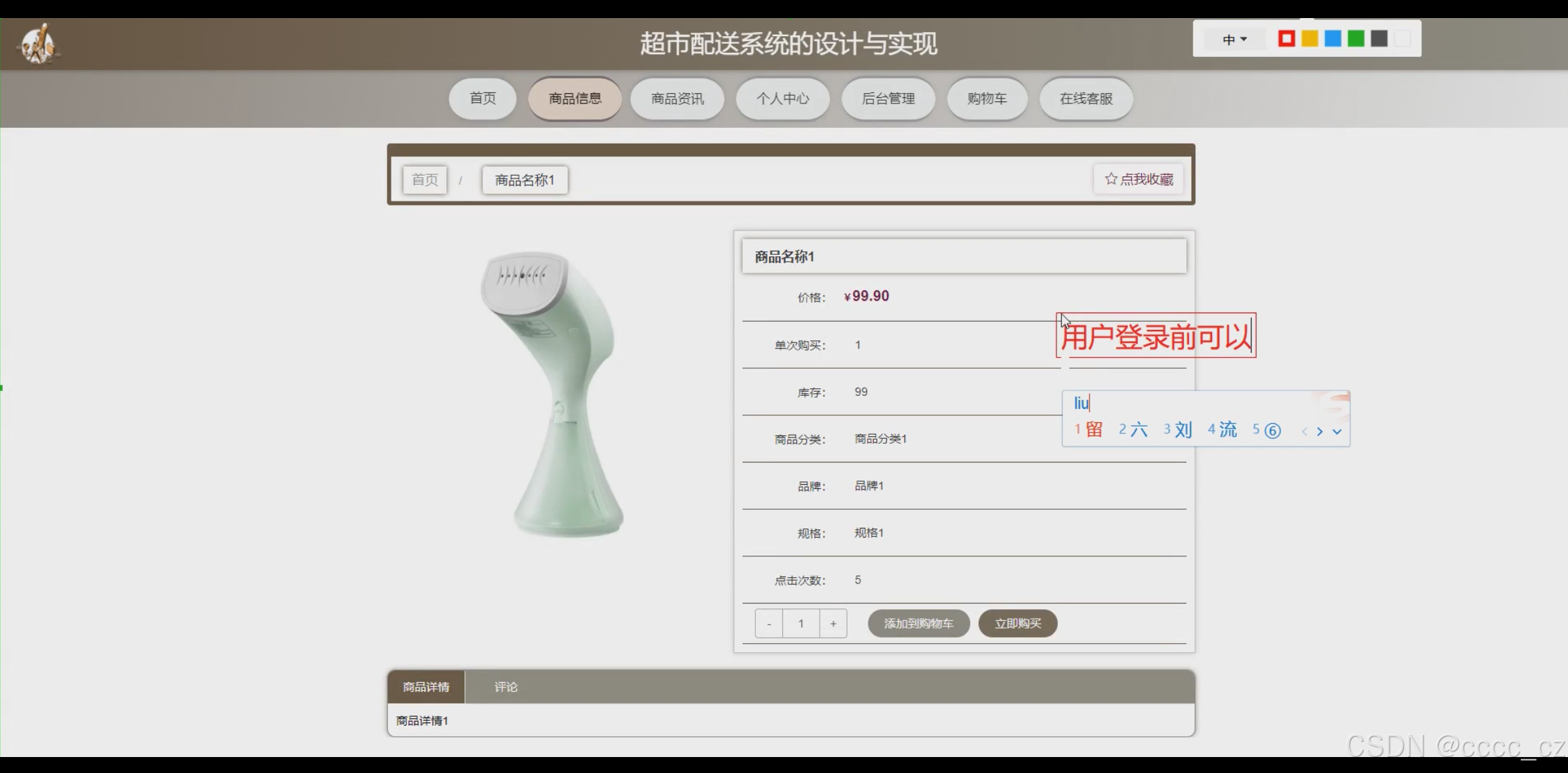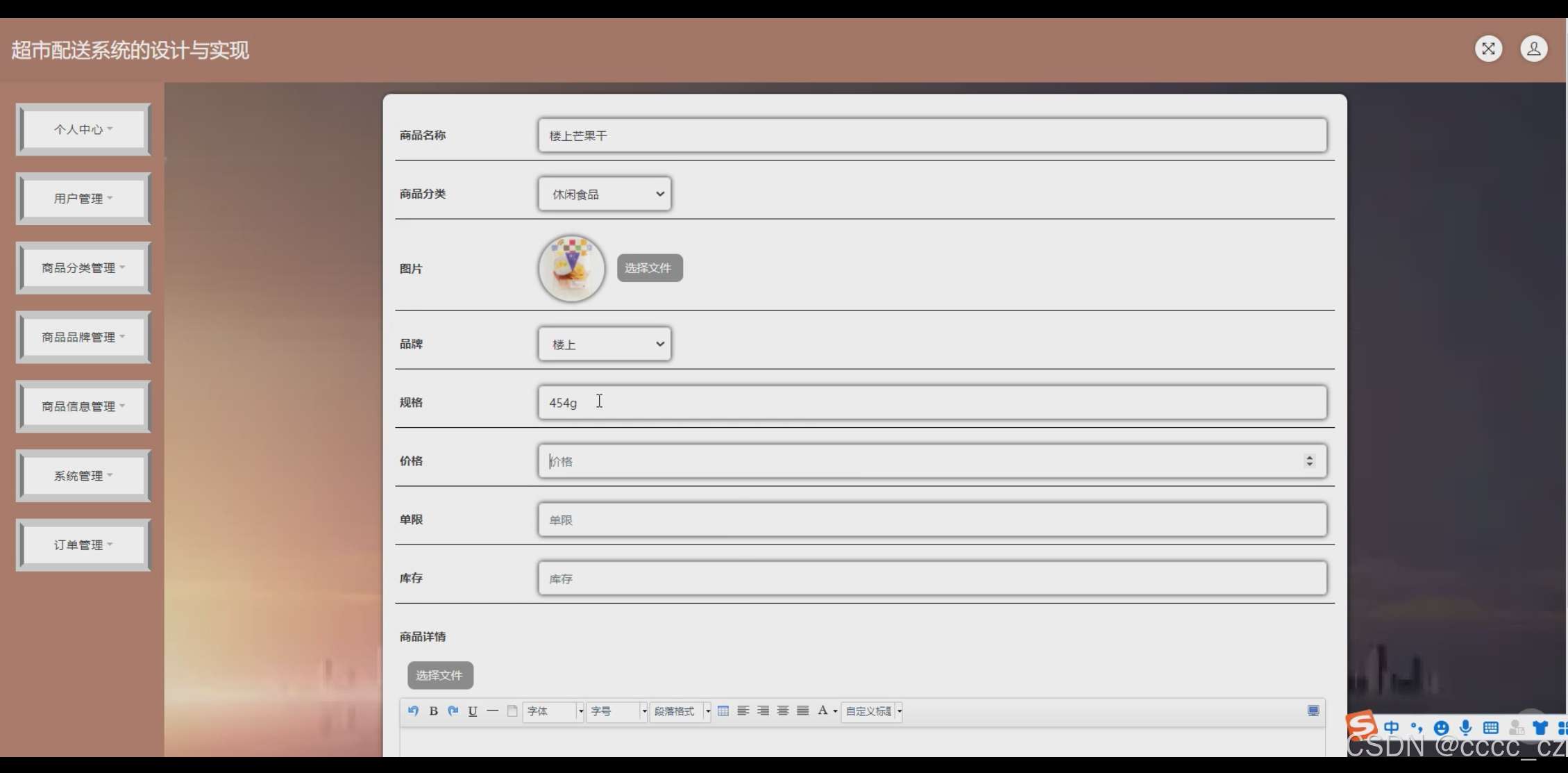 商品信息是超市配送系统的核心数据,该模块负责商品的详细信息录入、编辑、查询和展示。系统需支持商品的名称、价格、规格、库存量、图片等多维度信息的展示,以及商品的上下架管理。此外,系统还应具备商品搜索功能,方便用户快速找到所需商品。