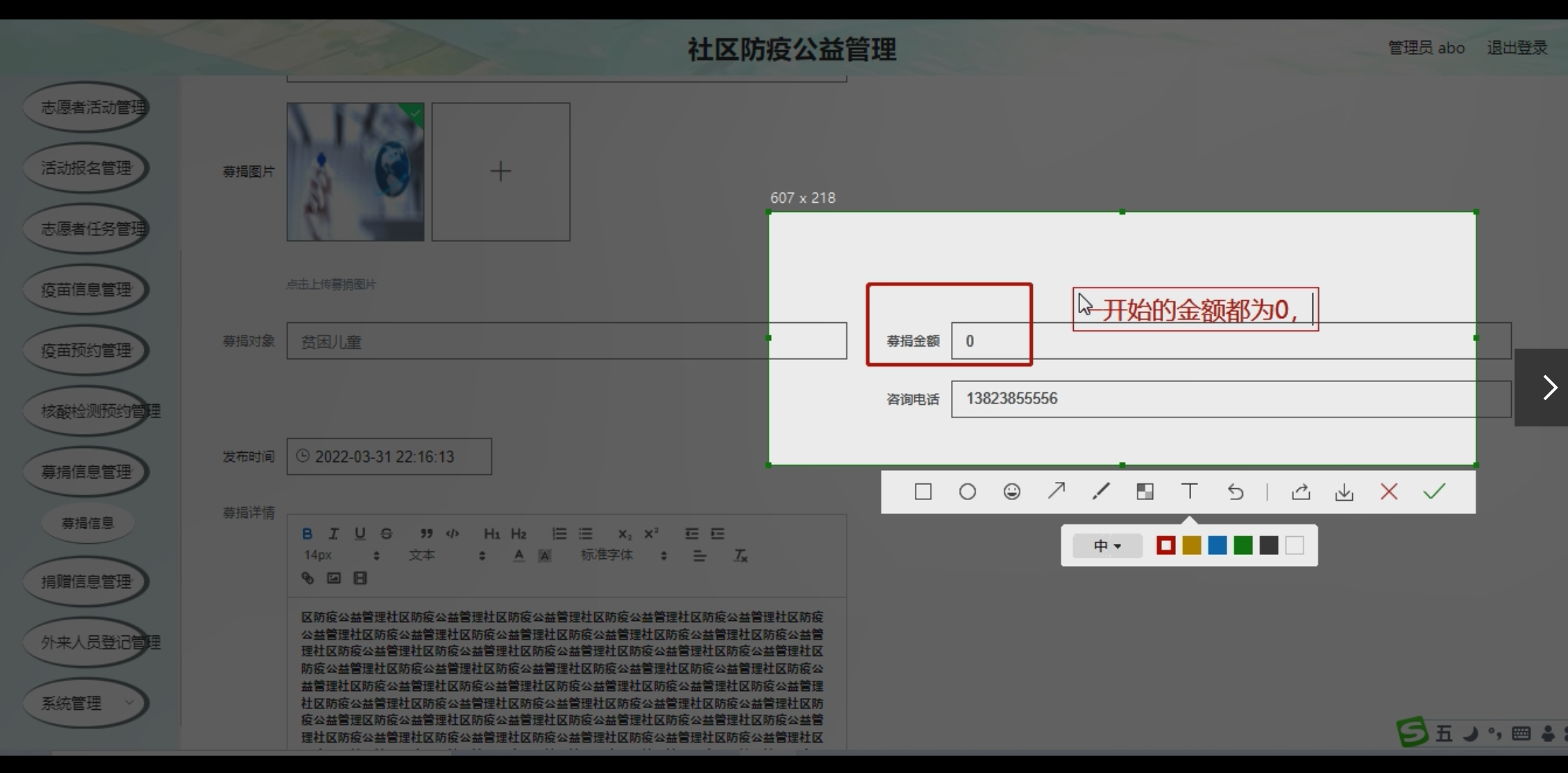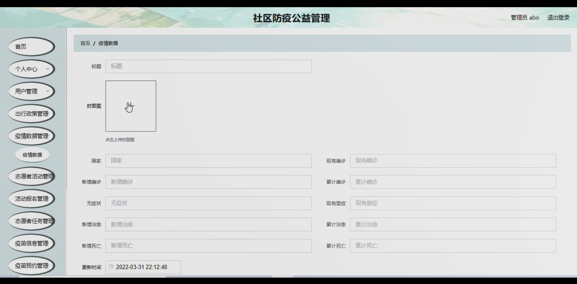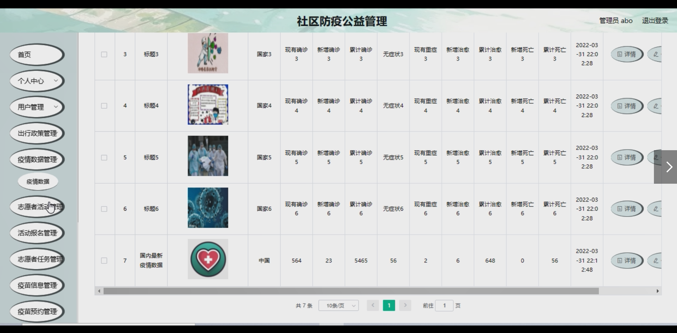 社区防疫是疫情防控的重要环节,涉及志愿者管理、疫情数据统计、疫苗预约等多方面工作。传统管理方式依赖人工操作,效率低且易出错。开发基于SpringBoot的社区防疫公益管理系统,可整合志愿者活动、疫情数据、疫苗预约等功能,提升社区防疫工作的数字化水平。该系统将覆盖用户管理、志愿者任务分配、疫情信息发布等核心模块,为社区提供高效、透明的防疫支持。