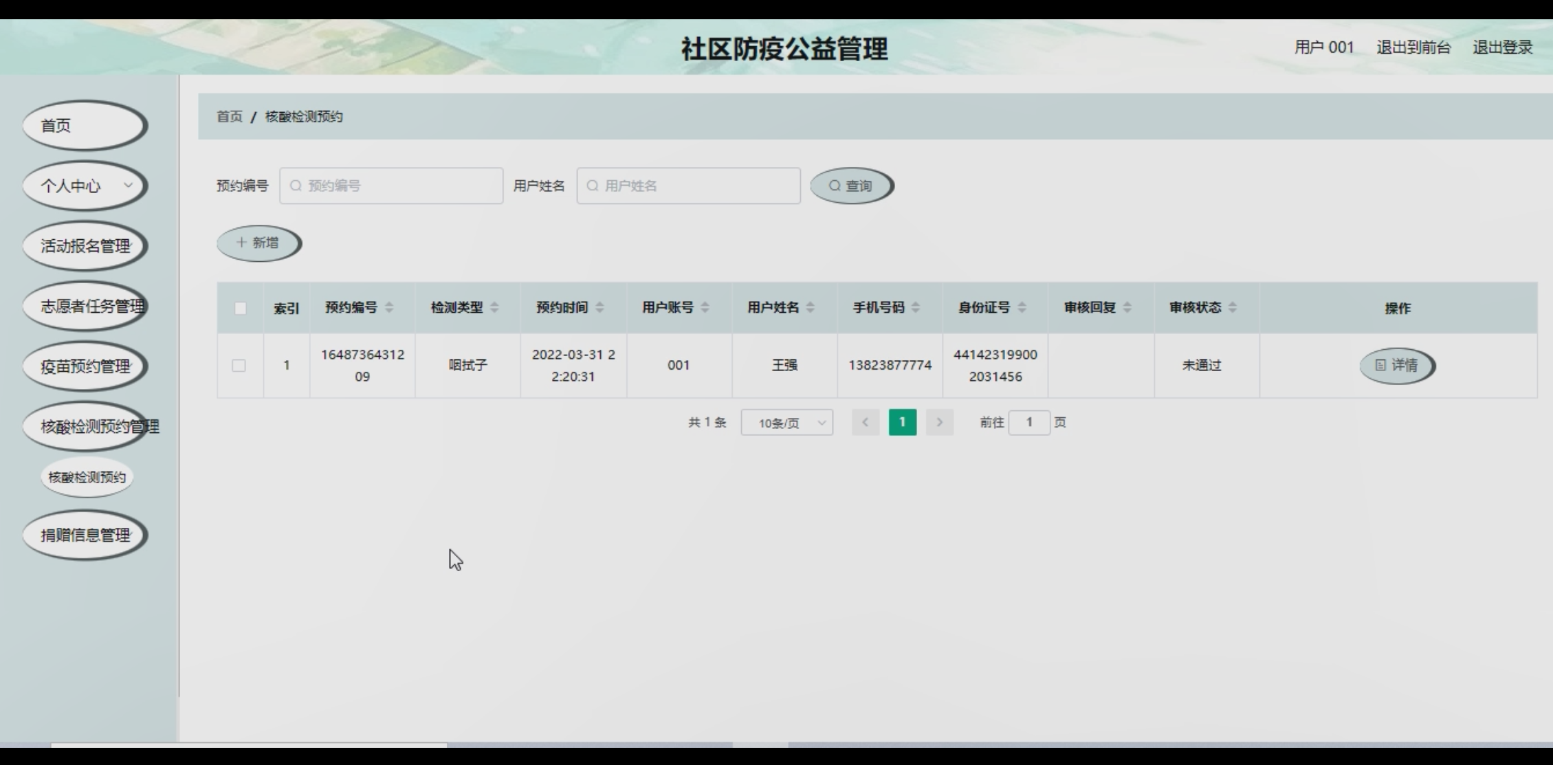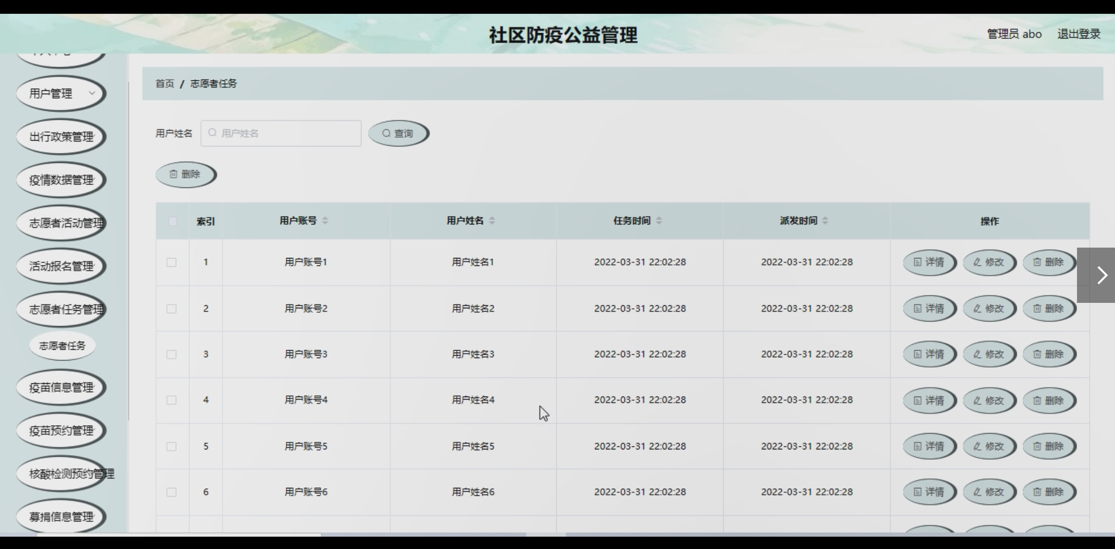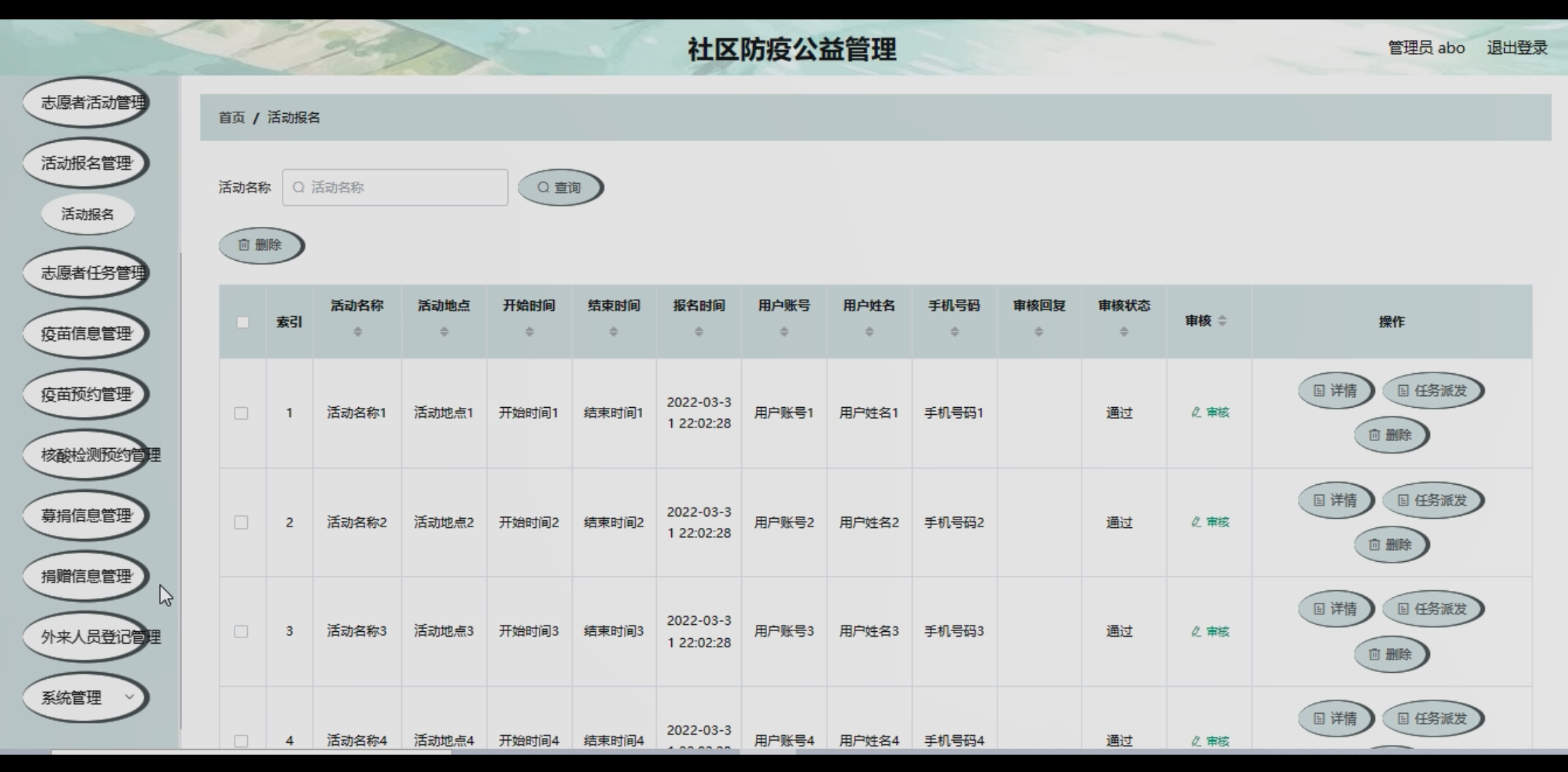 - 志愿者活动发布与报名,支持活动分类(如物资配送、核酸检测协助)。