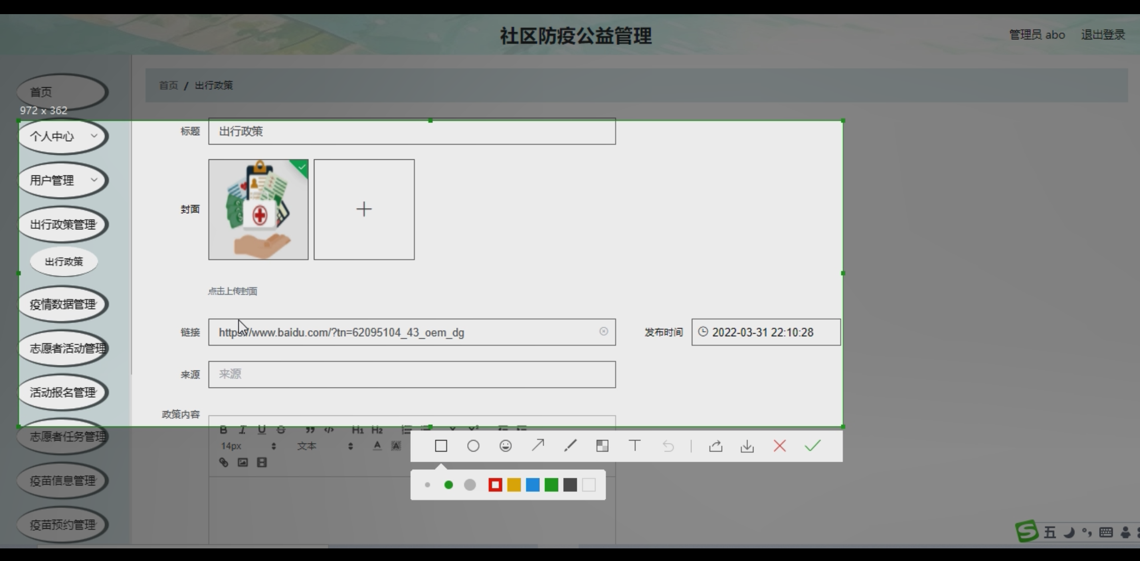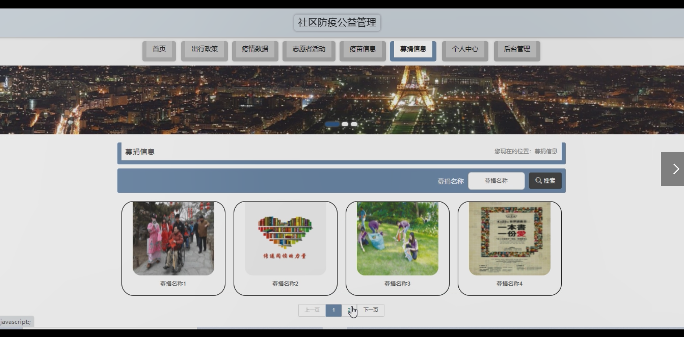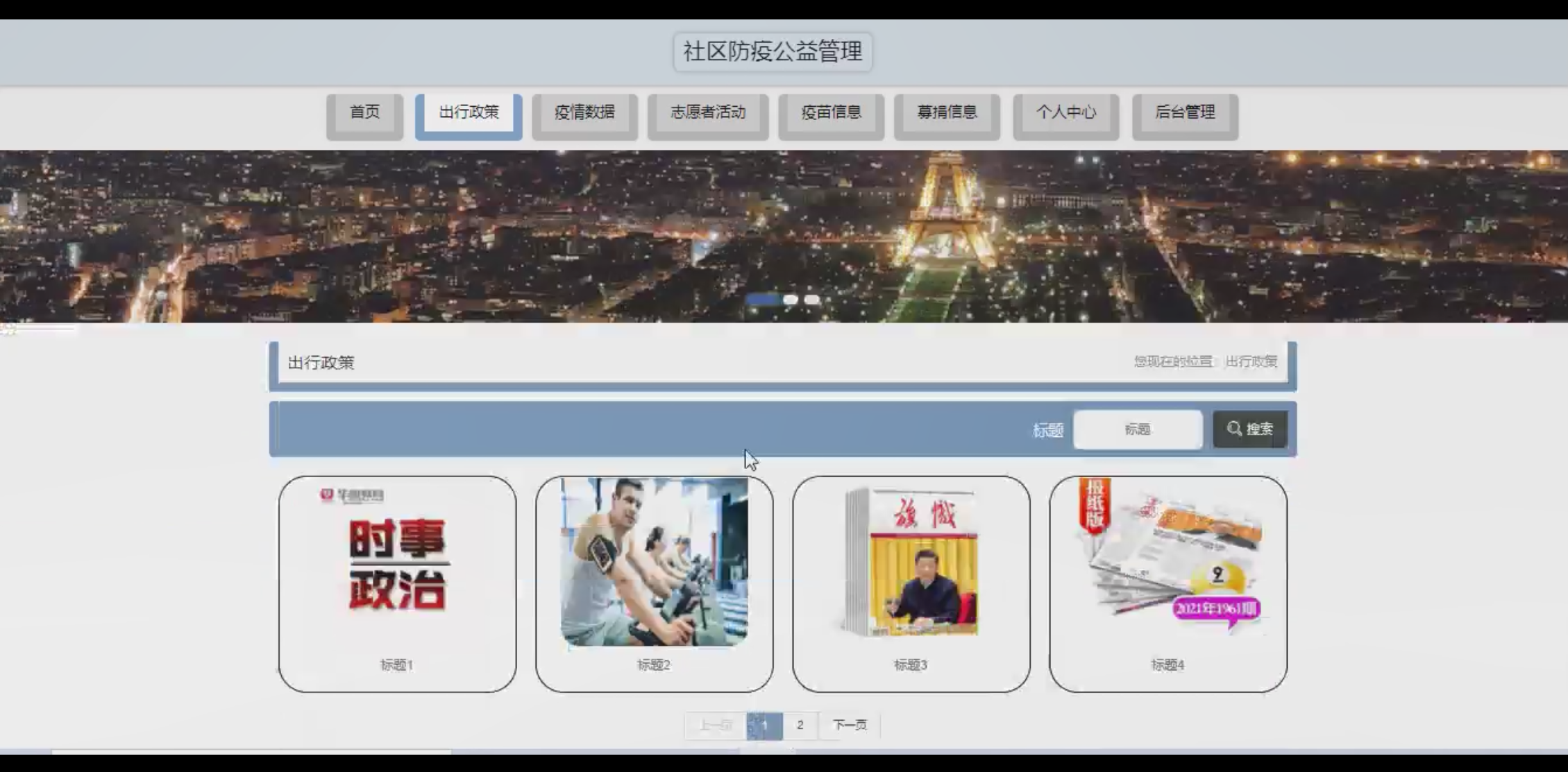 - 志愿者活动发布与报名,支持活动分类(如物资配送、核酸检测协助)。